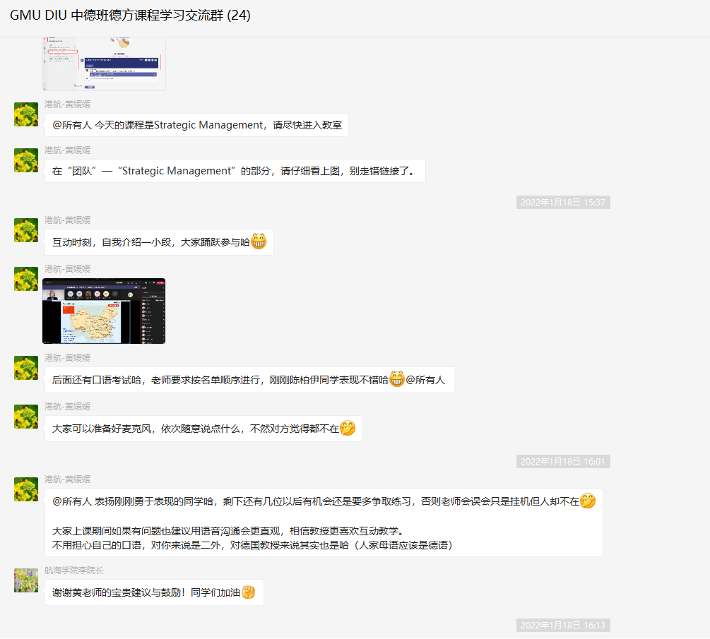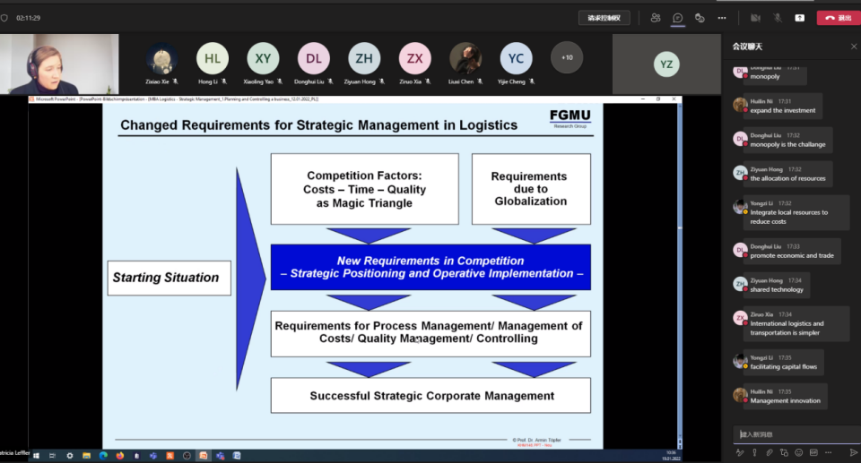 窗根据该项目的培养计划,“4+1”中德国际班将引进7门外方硕士前置课程,此次首批引进的课程分别是《战略管理》与《变更管理》。授课采用线上直播的形式,每门课程根据学科特点和学习要求,综合采取“课程展示、分组讨论、案例分析、成果汇报”的教学流程,充分调动同学们的学习主动性,培养学生团队协作能力、思辨能力、表达能力、写作能力、自主学习能力及利用专业知识开展科学研究与社会调查的能力。