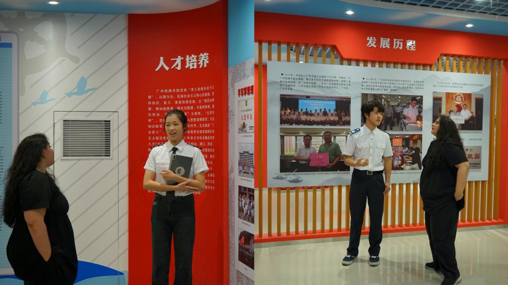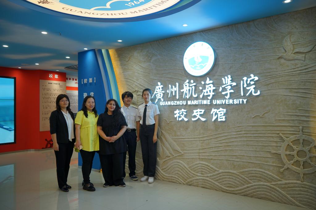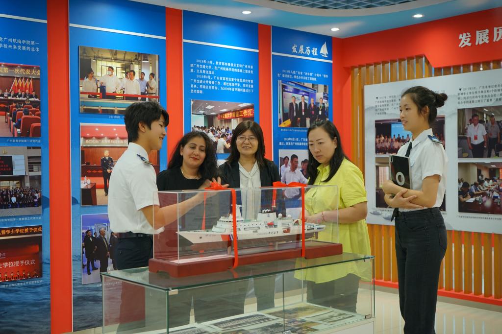 首先,两位国际班学生为外宾友人介绍了我校的发展历程,讲述了广航人励精图治,不懈追求的奋斗经历,通过几十年的艰苦努力把学校从最初的船员中专学校逐步建设成华南地区唯一独立建制的海事本科院校,并成为华南地区航运业高级人才的培养基地,为广东乃至全国航运事业的发展做出了贡献,被誉为“航海家的摇篮”。在图片和数据栏前,两位国际班学生向外宾介绍了我校在教学、科研、社会服务等方面取得的巨大成就。最后,向他们介绍了我校雄厚的师资力量和历年来学校培养出的各行各业精英人才。在讲解过程中,外宾友人兴致勃勃,不时询问照片中的人物和故事,两位国际班学生和带队老师向外宾友人一一解答。他们尤其对校史馆的国际化办学部分表现了浓厚的兴趣,希望未来与学校继续深入合作,共同谱写国际化办学的新篇章。通过聆听讲解,参观校史馆内丰富的图文与视频介绍,外宾友人深切地感受到我校不平凡的发展历史和独具特色的文化底蕴。校史馆大量丰富的史料,讲解人员流利的英语,工作人员的热情周到,都给外宾友人留下了深刻美好的印象,连连为我校点赞。