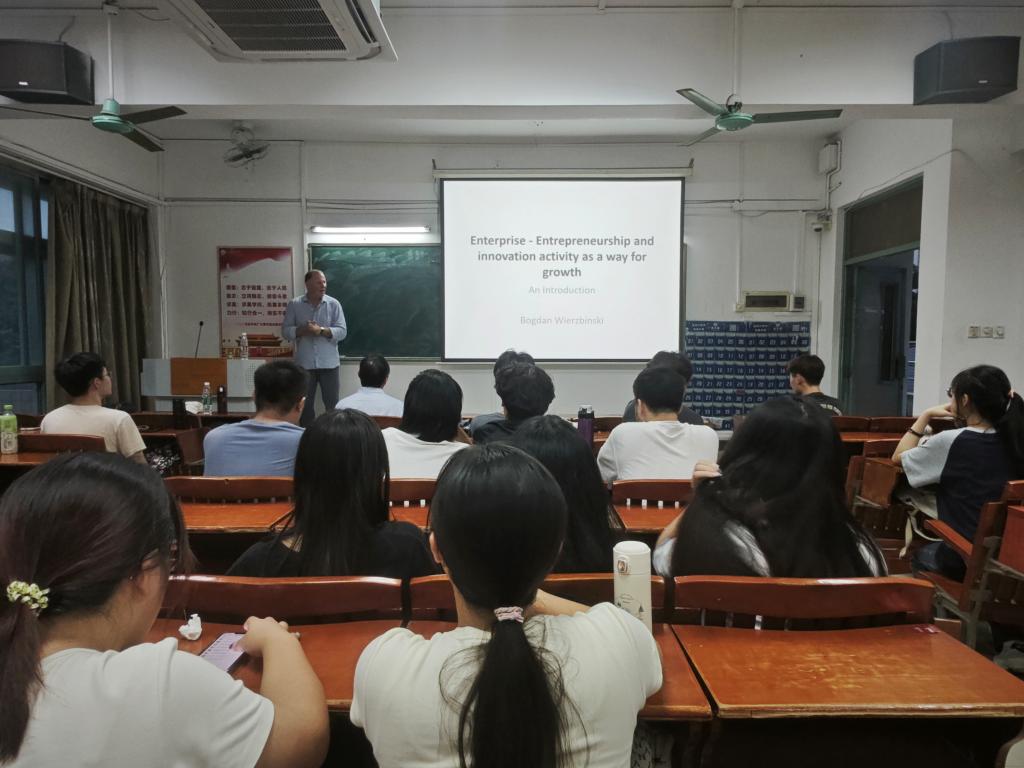 Bogdan教授是热舒夫大学人文学院的副院长,主要从事市场经济等方面的研究。他首先介绍了波兰的经济、地理和人文情况,顺势巧妙地引入了创新和创业的概念,分析了企业在不断变化的市场环境中遇到的问题以及创业活动所提供的机遇,同时与同学们就创业活动如何在这一背景下蓬勃发展进行了探讨。讲座内容丰富,深入浅出,大家听得津津有味,不断提出关心的问题,Bogdan 教授都耐心地作了解答。