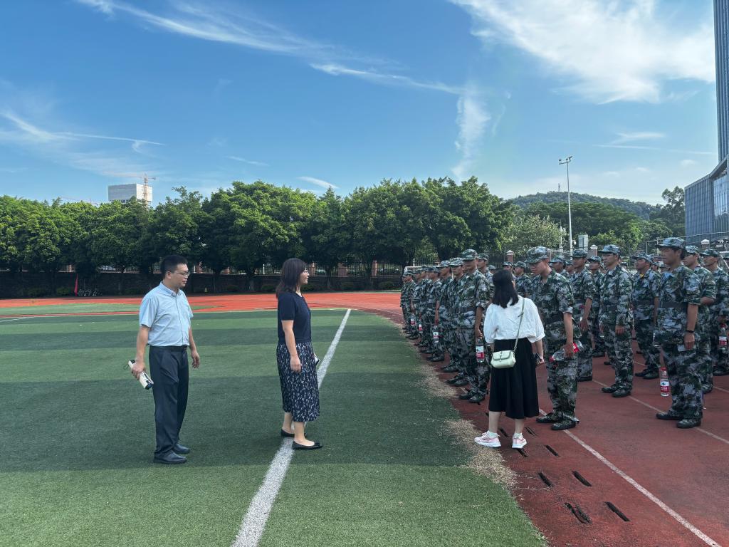 李虹首先代表学院向2024级新生致以中秋佳节的诚挚问候。她强调,军训是大学生活的重要组成部分,是锻炼意志、培养纪律意识的良好机会,希望同学们珍惜这段时光,发扬吃苦耐劳的精神,以饱满的热情和昂扬的斗志投入到军训中。黄赞向教官询问了我院学生军训工作的开展情况,并代表学院对其辛勤付出表示感谢。他高度赞扬新生们勇往直前、团结互助的军训精神,鼓励各位新生不仅要在军训中磨砺坚韧意志,锤炼坚毅性格,更要将军训中养成的优良品质贯彻到今后的学习和生活中。