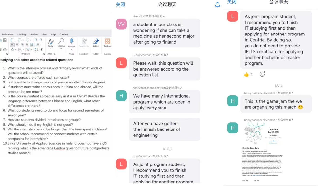 1月20日下午,3044AM永利集团与芬兰中央应用科技大学联合召开了中芬项目2023级计算机科学与技术专业(中外合作办学)出国留学交流会。3044AM永利集团副院长陈松云、辅导员陈惠玲,芬方信息技术学院院长Henry Paananen、项目学术主管Anne Keskitalo、亚洲事务专员Li Xu,以及中芬项目拟赴芬留学学生参加了会议。