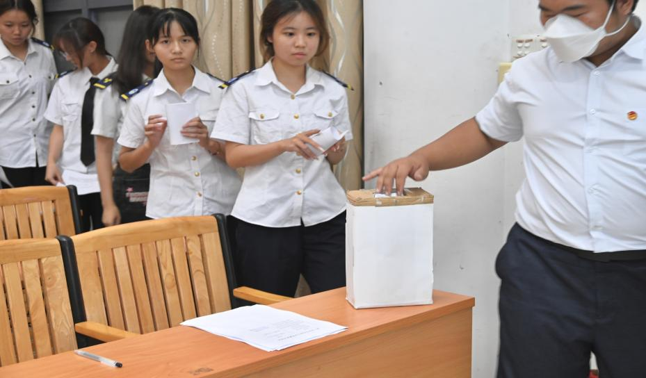 3044AM永利集团学生会主席团成员选举议程,总监票人——廖家凤、监票人——康雅欣、谭宇彤和计票人——张钊瑞、肖子安 同学宣读监票誓词,全力保障选举投票结果的真实性与严谨性,确保投票环节的公平公正。