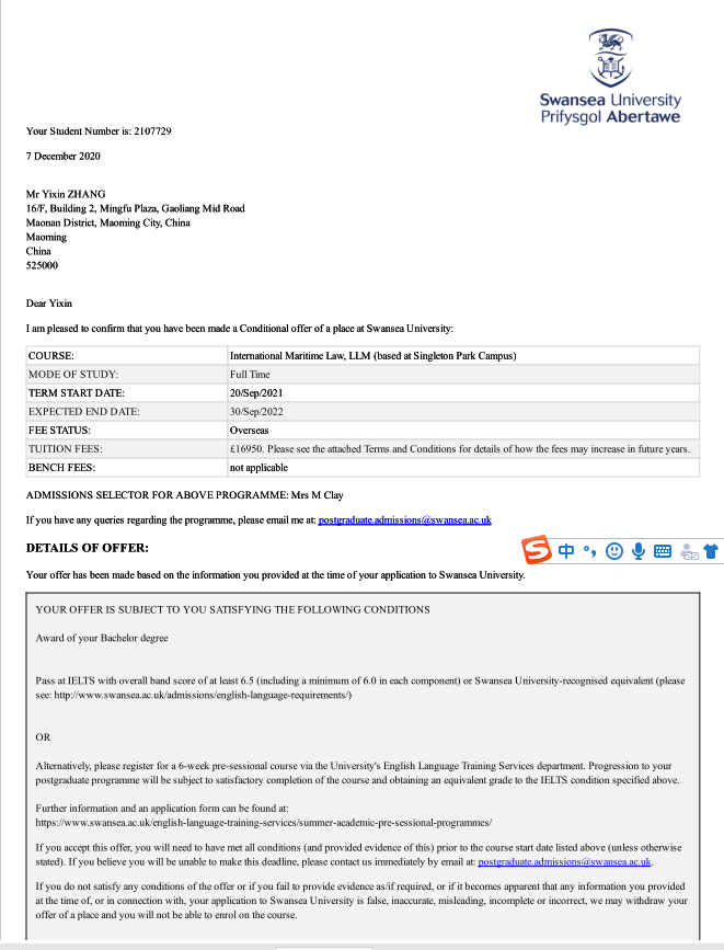 张艺馨,我校海运学院法学(海商法)专业171班学生,勤奋好学,目标明确,认真备战雅思,取得7.0的好成绩,2020年12月被英国斯旺西大学录取为海商法专业硕士研究生,并获得英国斯旺西大学1000英镑奖学金,将于2021年9月出国深造。这是斯旺西大学根据2020年6月两校合作协议,首次在我校录取硕士研究生。