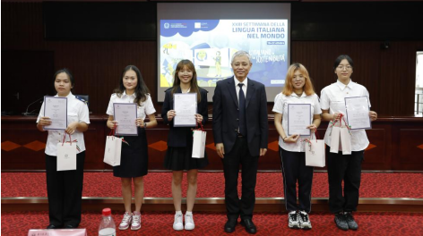 在颁奖典礼上,邹书记校长致辞祝贺我校2023年意大利语言周活动取得圆满成功。德派罗总领事致辞说明意大利语言周的背景和意义,并对我校意大利语言周视频比赛予以充分肯定和赞赏。Letizia Cinganotto教授致辞对获奖学生及作品予以肯定和鼓励。最后,德派罗总领事、毕修颖副校长、Letizia Cinganotto教授等分别为获得短视频竞赛一、二、三等奖的学生颁奖,鼓励他们继续努力,为促进中意文化交流多出一份力!